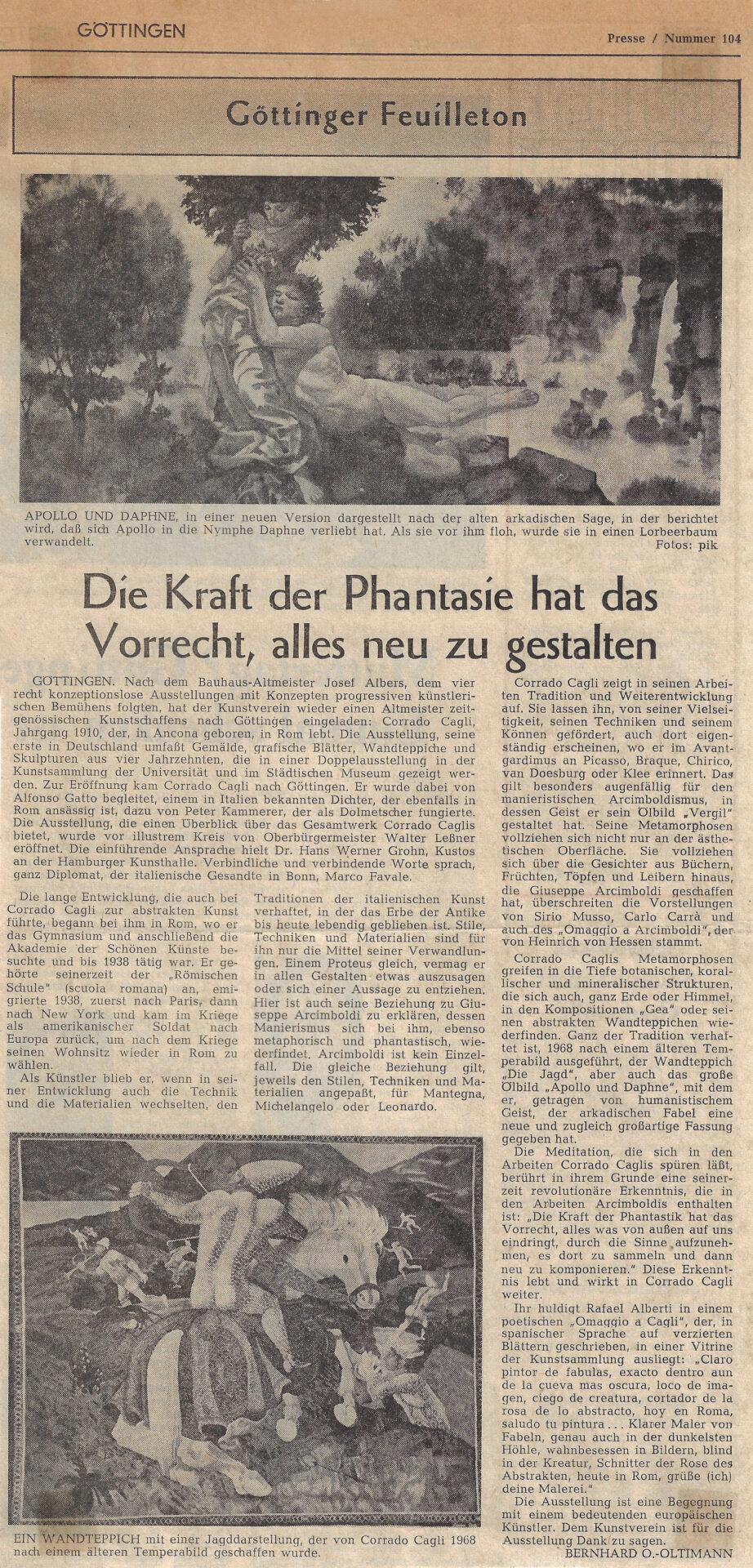L’esposizione, a cura dell’Associazione degli artisti e dell’Università di Göttingen, mostra per la prima volta al pubblico tedesco circa 350 opere tra disegni, dipinti, sculture e arazzi. In catalogo una presentazione di G. Ungaretti (la medesima della mostra di Palermo del ’67) e F. Burda.